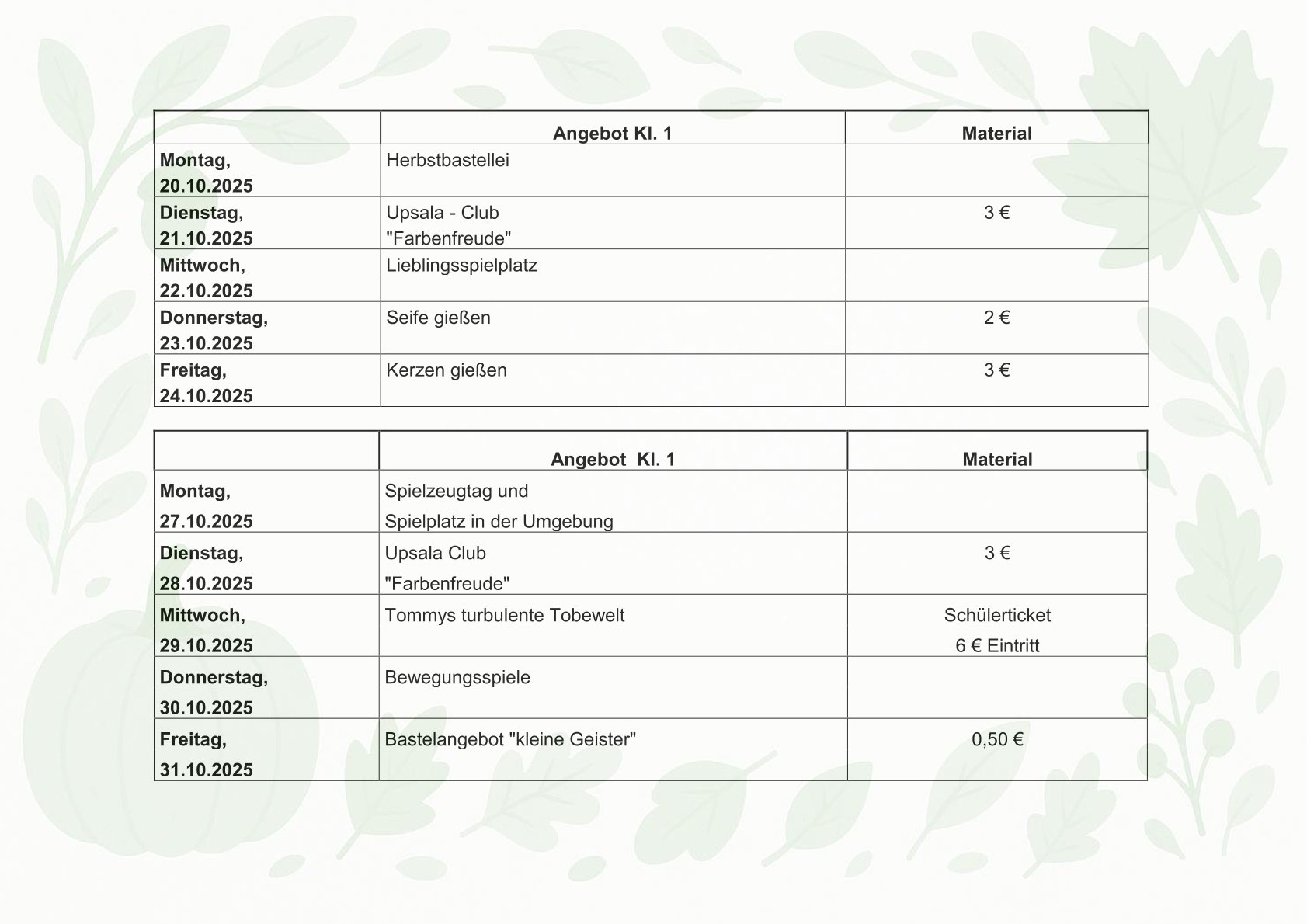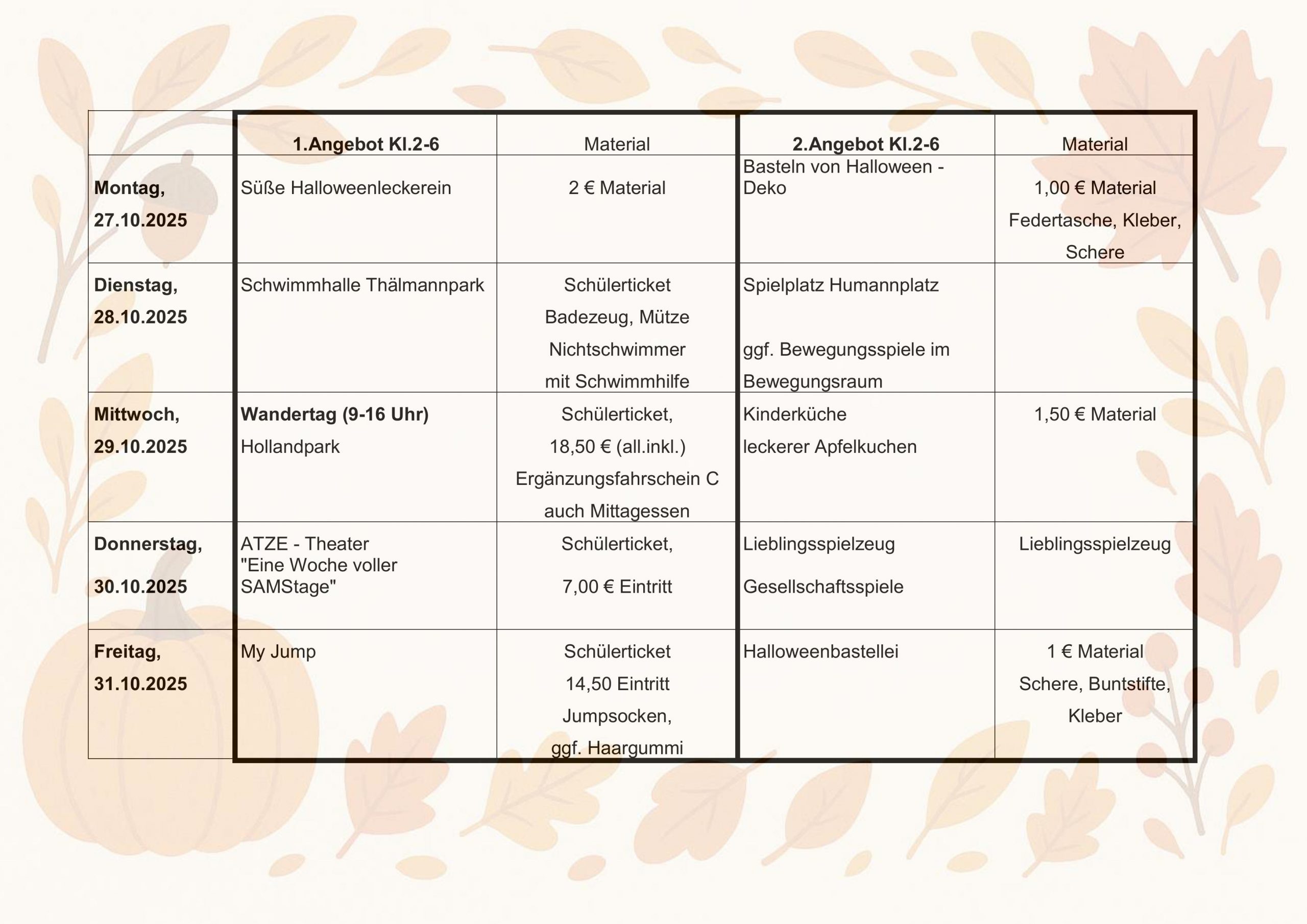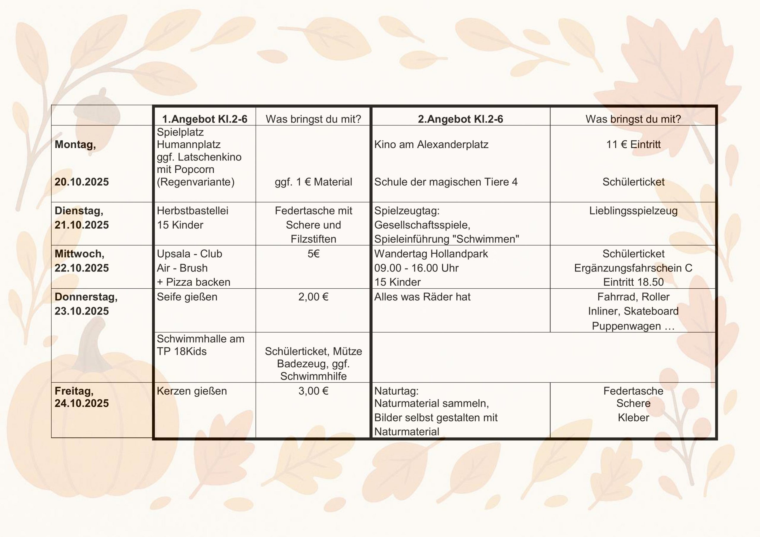 Für alle teilnehmenden Kinder der Ferienbetreuung ist bitte auf witterungsentsprechende Kleidung, sowie auf das Mitbringen des Schülertickets und der notwendigen Material- oder Eintrittsgelder zu achten.
