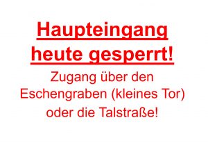 Das Schulgelände darf bis auf Weiteres nur über den Eingang Eschengraben (am Müllkäfig) und über das kleine Tor in der Talstraße betreten werden. Das Gebäude ist über den großen Eingang E (Foyereingang) und den Hintereingang E2 zu betreten.